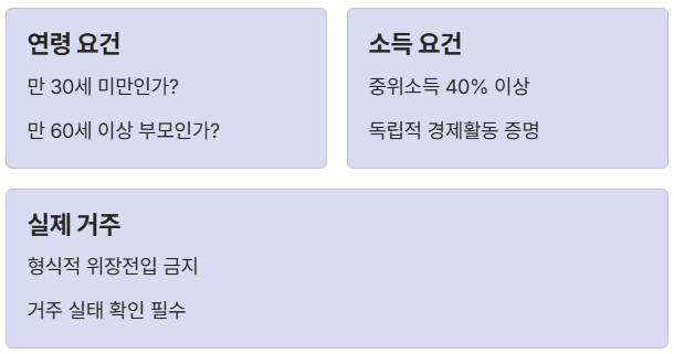 - 만 30세 미만 자녀: 소득이 중위소득 40% 이상이고 독립된 생계를 유지한다면 세대 분리가 인정됩니다.