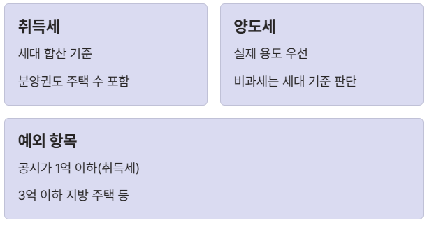 가장 먼저 기억해야 할 점은 세목별로 주택을 세는 방식이 다르다는 것입니다. 취득세는 '취득하는 시점'의 세대별 주택 수를 보고, 양도세는 '파는 시점'의 개인별(또는 세대별 비과세 요건) 주택 수를 따집니다.