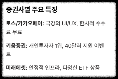 | 미래에셋증권 | 0.07% (신규 기준) | 안정적인 인프라, 다양한 ETF |