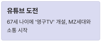 - 유튜브 도전: 67세 나이에 '영구TV' 개설, MZ세대와 소통 시작