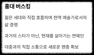 - 현장 소통: 홍대 버스킹 등 대중과 직접 만나는 소통 행보 지속