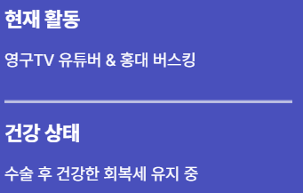 | 주요 활동 | 유튜브 '영구TV' 채널 운영 및 홍대 버스킹 공연 |