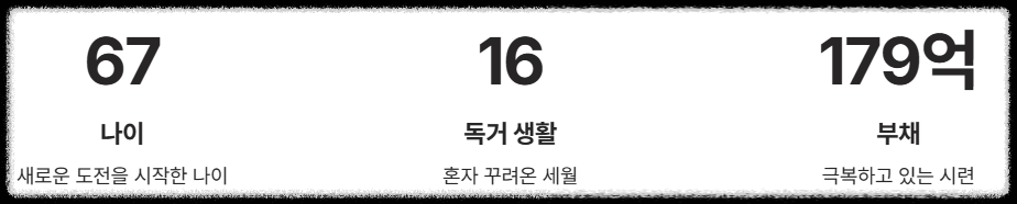 | 생활 환경 | 서울 강남 소재 16년째 독거 생활 중 |