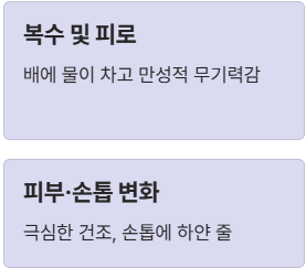 - 피부 및 손톱 변화: 영양소 운반이 원활하지 않아 피부가 극도로 건조해지거나 손톱에 하얀 줄이 생기는 등의 변화가 관찰되기도 합니다.