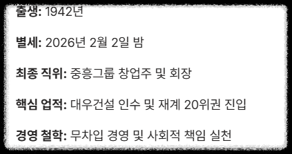 대한민국 건설업계의 산증인이자, 광주·전남 지역 건설사의 신화를 일궈낸 중흥그룹 정창선 회장님께서 2026년 2월 2일 밤, 향년 84세를 일기로 영면에 드셨습니다.