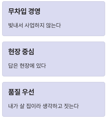 - 품질 우선: 내가 살 집이라고 생각하고 짓는다.