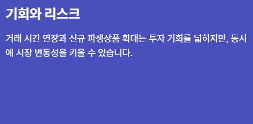 거래 시간 연장과 신규 파생상품 확대는 투자 기회를 넓히지만, 동시에 시장 변동성을 키울 수 있습니다. 개인 투자자분들은 충분한 학습과 리스크 관리가 병행되어야 합니다.
