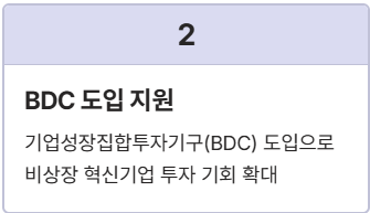 | BDC 도입 지원 | 기업성장집합투자기구(BDC) 도입으로 비상장 혁신기업에 대한 일반인 투자 기회 확대 |