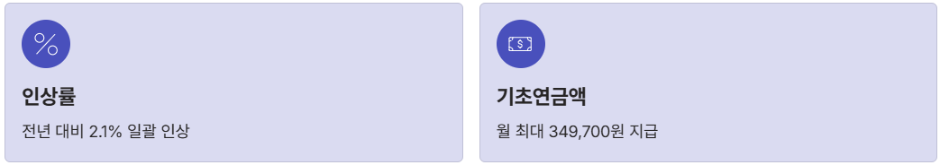 2. 국민연금: 기존 수령액 대비 일괄 2.1% 인상 (예: 100만 원 수급 시 102.1만 원)