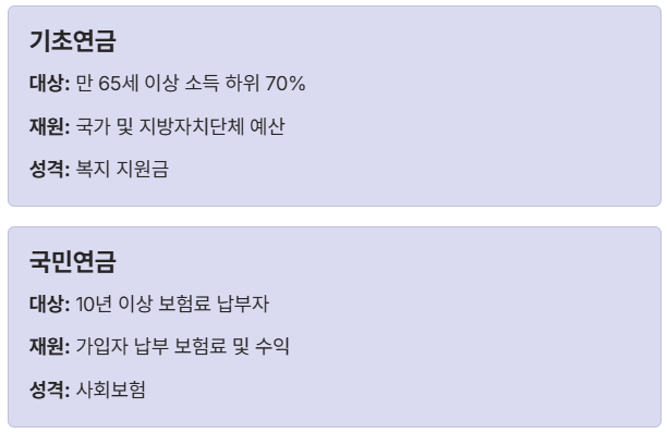 | 구분 | 기초연금 | 국민연금(노령연금) |