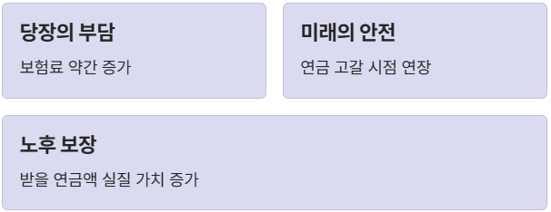 보험료 부담은 조금 늘어나지만, 긍정적인 소식도 있습니다. 노후 소득 보장을 강화하기 위해 소득대체율이 43%로 상향 조정되었습니다. 이는 미래에 받게 될 연금액의 실질 가치를 높이는 조치입니다.