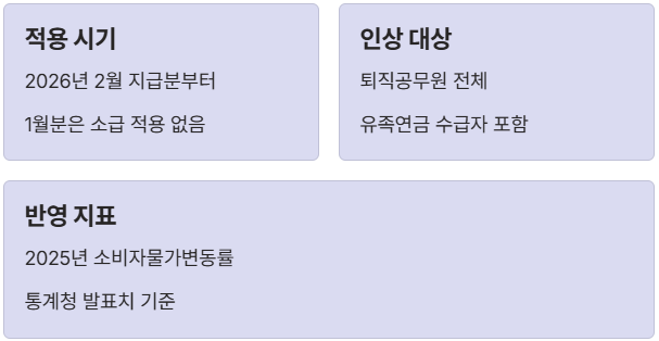 - 인상 대상: 공무원연금을 수급 중인 모든 퇴직공무원 및 유족연금 수급자